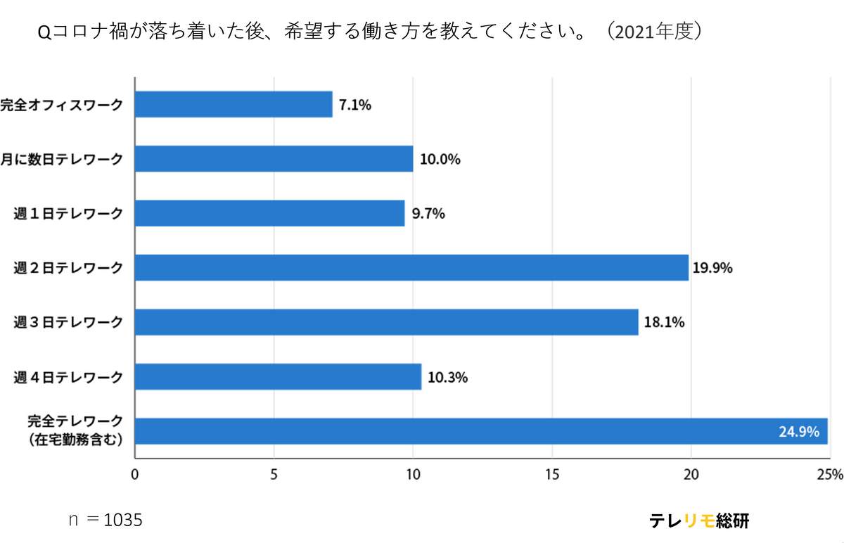 テレワーク経験のあるワーキングパーソン(20歳~65歳の男女1035人/2021年9月27日~30日)を対象としたこの調査では、「コロナ禍が落ち着いた後、希望する働き方」について聞いたところ、最多は「完全テレワーク(24.9%)」で、「週2テレワーク」(19.9%)、「週3テレワーク」(18.1%)と続いている=図表1参照。
