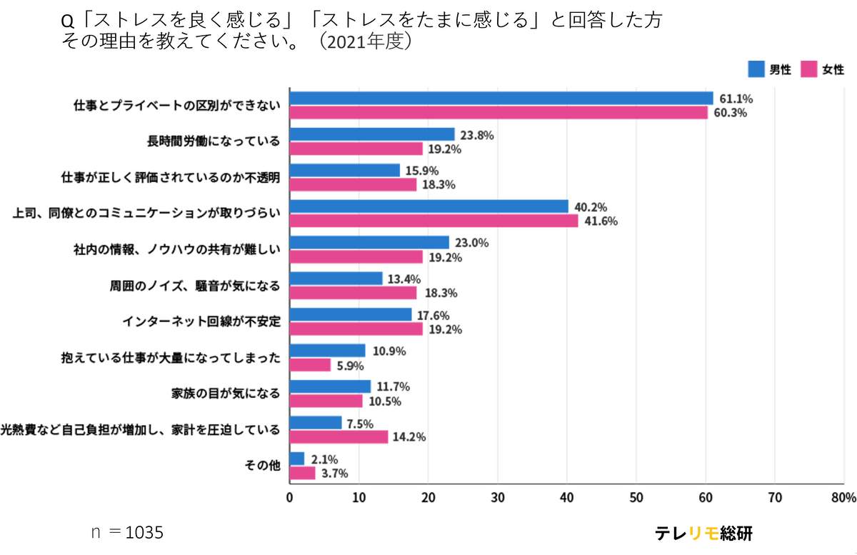 では、具体的にストレスの理由はなんだろうか――。調査結果では、男女とも最多だったのが「仕事とプライベートの区別ができない」で男性61.1%/女性60.3%。次いで「上司、同僚とコミュニケーションが取りづらい」が男性40.2%/女性41.6%、「長時間労働になっている」が男性23.8%/女性19.2%、「社内の情報、ノウハウの共有が難しい」も男性23.0%/女性19.2%が上位にあった=図表3参照。