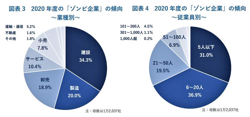 2020年度に「3年連続でICRが1未満、かつ設立10年以上」の企業1万2037社に限って業種別にみると、「建設」(34.3%)で最も多く、次いで「製造」(20.0%)、「卸売」(18.9%)、「サービス」(同10.4%)が続いた=図表4参照。