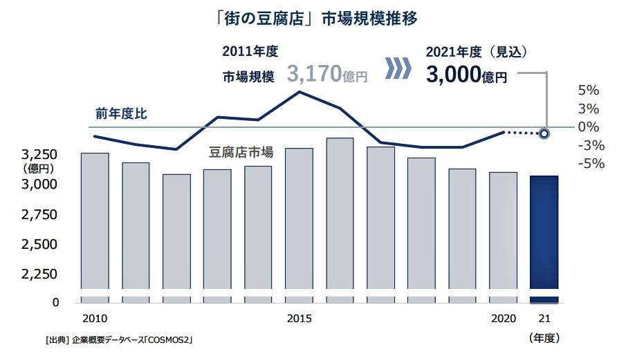 帝国データバンクの調査によると、2021年度の「街の豆腐店」市場(事業者売上高ベース)は約3000億円規模に達する。市場は2016年度をピークに5年連続で減少を続けている。だが、減少ペースは、コロナ禍の2020年度以降は小幅にとどまった=図表1参照。