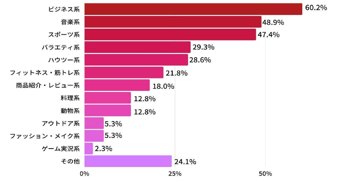 それは会社の経営者や役員といったエグゼクティブも例外ではない。彼らに、「日常的に視聴するYouTubeのジャンルはなんですか?」(複数回答)と質問したところ、やはり「ビジネス系」が60.2%でトップ。次いで「音楽系」が48.9%、「スポーツ系」が47.4%だった。