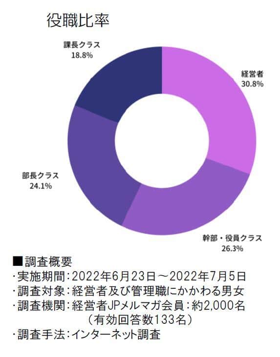 なお、調査したエグゼクティブを役職別で分けると、経営者が30.8%、幹部・役員クラスが26.3%、部長クラス24.1%、課長クラスが18.8%だった=右の円グラフ参照。