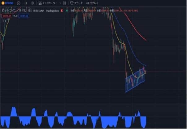 また、ビットコインと米ドルについては逆相関があるという話もあります。ドルが弱いときに資産の逃避先として仮想通貨が買われると考えると、確かにわからない話ではないですし、相関を表すインジケーターを見ても逆相関の部分が多いと思います=図下部の青色のインジケーター、0より上なら正相関、下なら逆相関。では、指標結果から米国経済が強く利上げが続くと考えた時にドル高の方向もまだ続くと考えられます。
