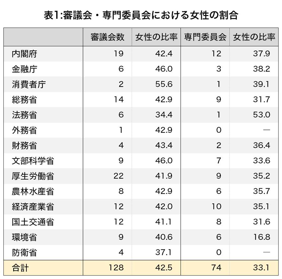 一方、専門委員会等では法務省の53.0%がトップで、次いで消費者庁の39.1%となっている。なお、外務省と防衛省には専門委員会が設置されていない=表1。