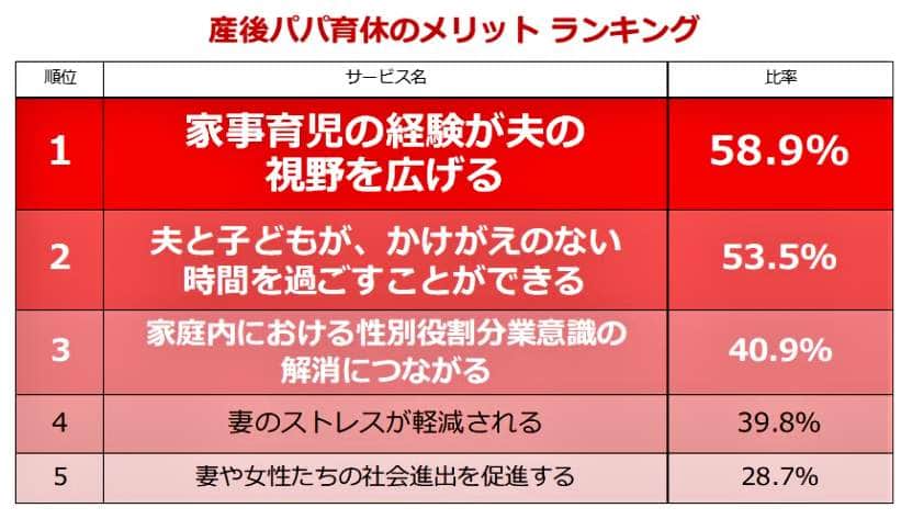 さらに、「夫と子どもが、かけがえのない時間を過ごすことができる」(53.5%)、「家庭内における性別役割分業意識の解消につながる(40.9%)、「妻のストレスが軽減される」(39.8%)と続いた=図表3参照。