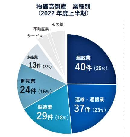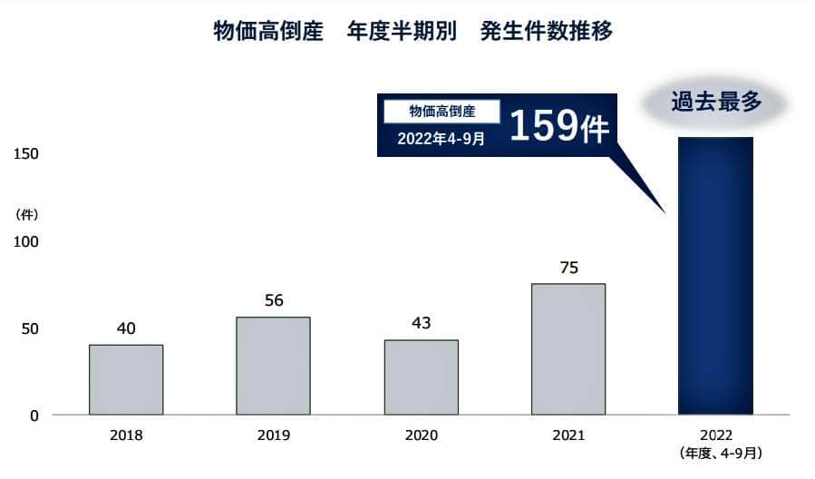 2022年度上半期の「物価高倒産」は159件となり、調査開始の2018年以降で最多だった前年同期(75件)から2倍以上に増加した。年末にかけてさらに増える見込みだという。