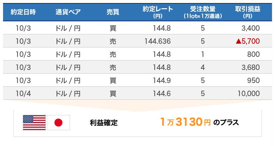 また個人的に忙しい日々を過ごしていたので、先週(9月26日週)に比べ、取引は少なくなっています。3日に5回と、4日に指値で1万円を利益確定して、今週(10月3日週)は満足しました。