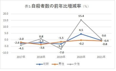 これに対し今回、新型コロナ前の日常に徐々に戻り始めた2021年の自殺者数は減少に転じたが、男女別では、男性が前年比116人(0.8%)減少したのに対して、女性は同42人(0.6%)増加で、増加傾向が続いている=表1。