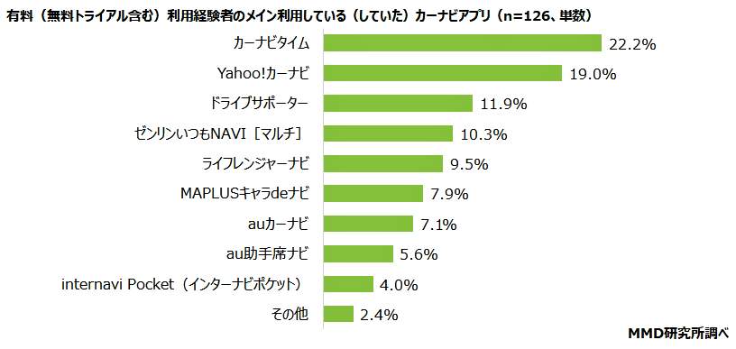 では、「有料」ではどのアプリの利用者が多いのだろうか。利用経験者に聞くと、「カーナビタイム」(22.2%)が最も多く、次いで「Yahoo!カーナビ」(19.0%)、「ドライブサポーター」が11.9%と続いた=図表3参照。