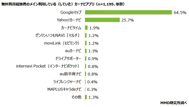 一方、「無料」のほうは、「Googleマップ」(64.5%)がダントツに多く、次に「Yahoo!カーナビ」(25.7%)と、この2つのサービスで全体の9割近くを占める結果となった=図表4参照。