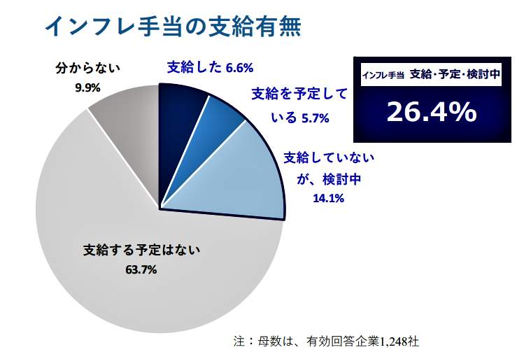 また「支給を予定している」は5.7%、「支給していないが、検討中」は14.1%となり、合わせると4社に1社(26.4%)がインフレ手当に取り組んでいる。一方、「支給する予定はない」は63.7%となった【図表1参照】。