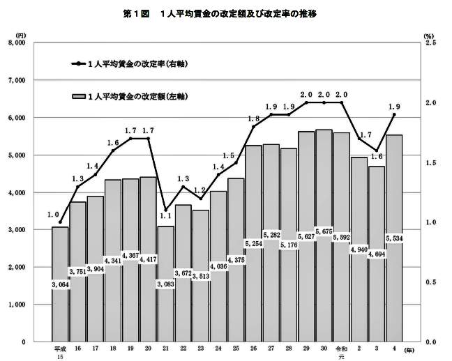 賃金を引き上げた企業の割合は、新型コロナの影響もあり、2年連続で前年を下回っていたが、3年ぶりに増加した。平均引き上げ額は5534円で、年率にすると1.9%の上昇となる【図表参照】。