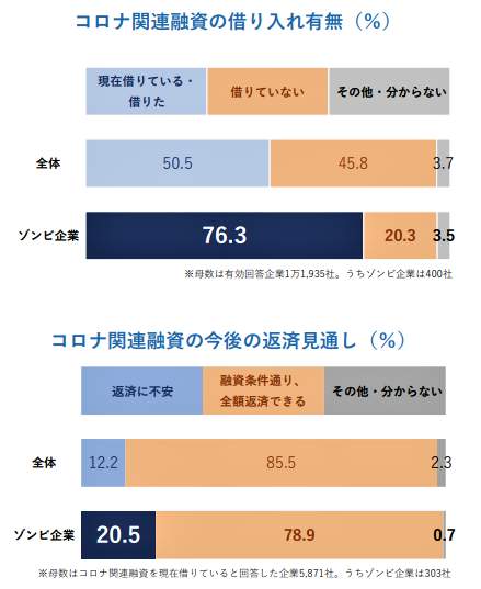 【図表3】は、企業にコロナ関連融資の借り入れ状況と返済の見通しを聞いた2022年8月の調査結果だ。これを見ると、「ゾンビ企業」の76.3%がコロナ関連融資を受け、うち20.5%が返済に不安を抱えている様子がうかがえる。それぞれの割合は企業全体の平均より高い。