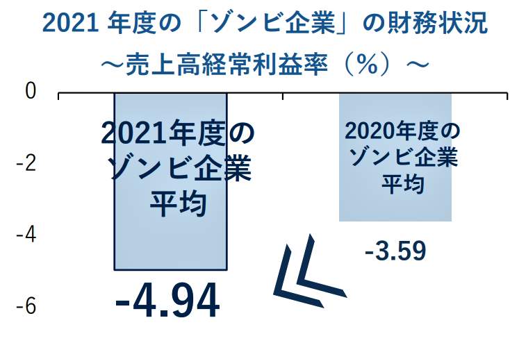 また、「ゾンビ企業」の財務状況を調べると、特に企業の収益力を示す「売上高経常利益率」が、2021年度の「ゾンビ企業」の平均がマイナス4.94%と、前年度(2020年度、マイナス3.59%)より悪化していることがわかる【図表4】。「有利子負債月商倍率」などを調べても悪化しており、過剰債務状態に陥っている企業がかなり多いことがうかがえる。