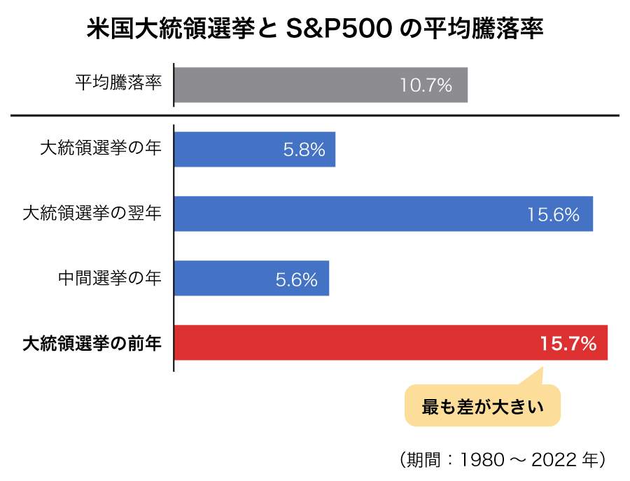 1980年~2021年の42年間で米国株(S&P500)の年間騰落率をみると、平均プラス10.7%となっています。しかし、大統領選挙の前年の平均騰落率は15.7%と、平均値を大きく上回っています。