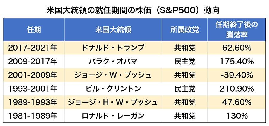 ちなみに、ほぼ同期間の1981年以降(ロナルド・レーガン~)の政党別の騰落率では、共和党が50.2%に対して、民主党が193.15%と圧勝でした。ただ、この期間に2回のみの民主党は2回とも2期連続であったことや、選挙年に共和党に代わる際に大きく上昇したなどの要因もあります。