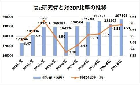 総務省が2022年12月16日に公表した「2022年科学技術研究調査」によると、2021年度の科学技術研究費(以下、研究費)は19兆7408億円で、前年度比2.6%増加した。研究費のGDP(国内総生産)に対する比率は3.59%と同0.01ポイントの上昇した。