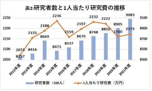 もっとも、2021年度の研究者1人当たりの研究費は2173万円で前年度比0.6%増加し、3年ぶりの増加となった。だが、2018年度の2232万円、2019年度の2222万円を下回っている。新型コロナの影響を受けた民間企業の業績を反映しており、研究費の民間企業への依存状態が浮き彫りになっている。(表2)
