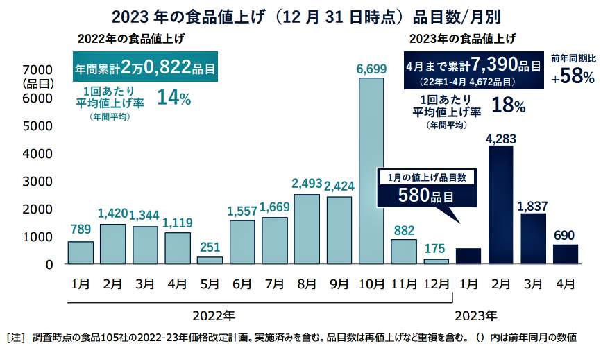 帝国データバンクの調査では、2022年末までに決定した2023年中の飲食料品の値上げ品目数は、4月までの予定を含め累計7390品目に上った【図表】。品目数は前年同時期(2022年1~4月、4672品目)に比べて約60%多い。