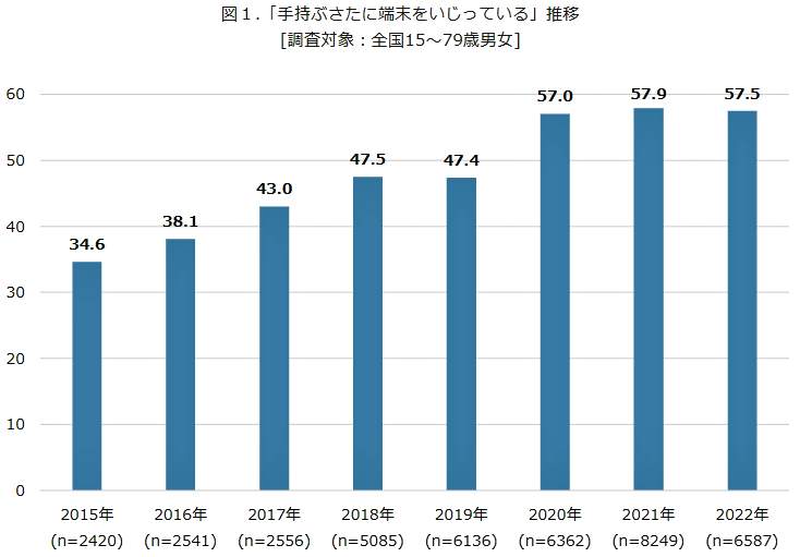 「手持ぶさたに端末をいじっている」と回答した人は、2015年は34.6%だったが、年々増加しており、2022年には約6割の57.5%に達した【図表1】。