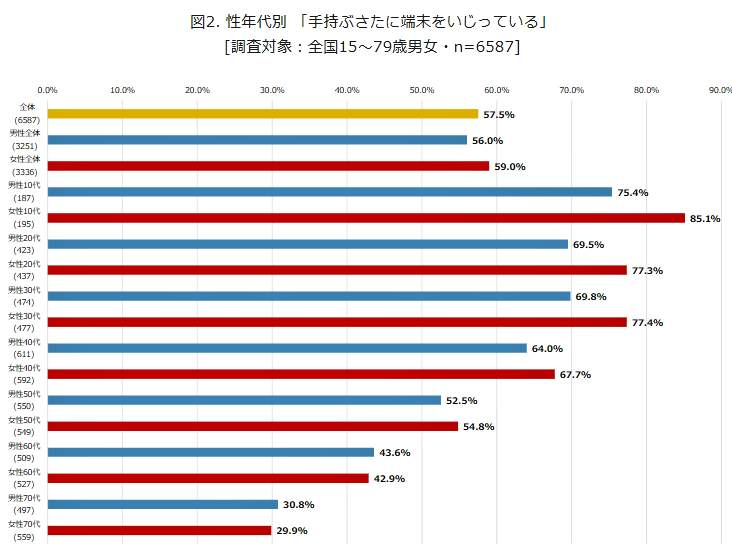 若年層は7~9割が「端末をいじっている」と答えており、特に女性の割合が高いことが目につく。一方で、60代以上のシニア層では「端末をいじっている」と答えた人は男女とも3~4割程度だった【再び図表2】