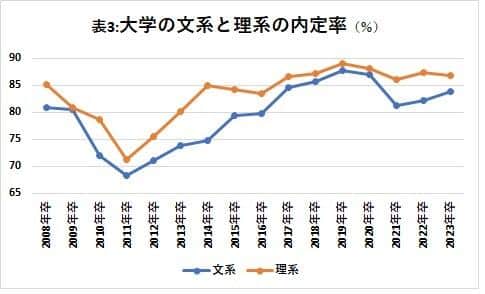 ただ、両者の就職内定率が一時的に接近した2009年卒の文系80.4%、理系80.8%を除けば、理系の内定率が文系を上回る構造が続いている。(表3)