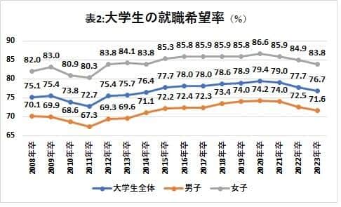 大学生の就職希望率...男子71.6%、女子83.8% やや減少傾向