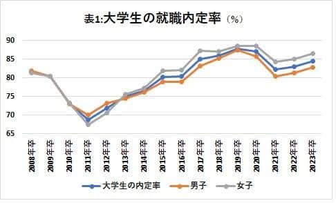 男女を比較すると、2013年卒に男子74.5%、女子75.6%と男子の内定率を女子が逆転して以降、2023年卒まで11年間、女子の内定率が男子を上回る状況が続いている。(表1)
