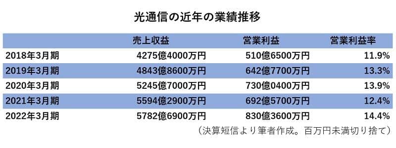 光通信の売上収益はコロナ禍の影響をもろともせず、2022年3月期には5782億円もの売上収益をあげており、4期連続増収となっています。