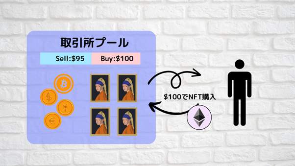 上の図のように、取引所は、NFT(=Non-Fungible Token=非代替性トークン)やFT(仮想通貨)が大量に入ったプールを用意し、ユーザーはプールの需給から導かれた価格で売買を行うことができます。