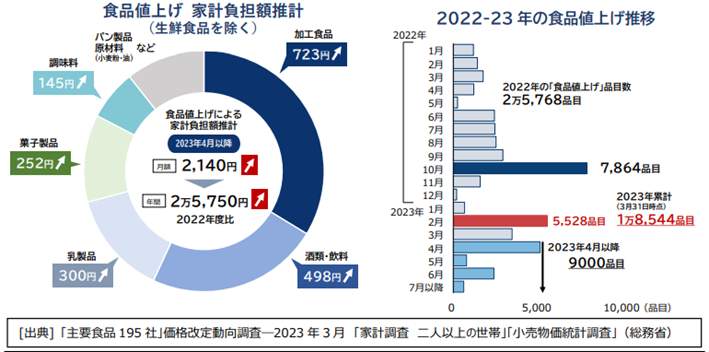 これまでのコスト増に加え、鶏卵の価格や電気代など新たな値上げに対応する価格転嫁が想定されるなか、同社は「2023年通年で前年に続き累計2万品目超えが確実となる見通しで、家計における食費負担は年後半にかけてさらに重くなる可能性が高い」とみている。