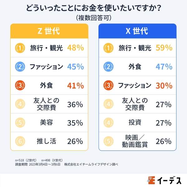 はじめの質問では、Z世代やX世代がどんなことにお金を使いたいのか聞いた。Z世代の上位は「旅行・観光」(48%)、「ファッション」(45%)、「外食」(41%)、「友人との交際費」(36%)、「美容」(35%)という結果がでた。