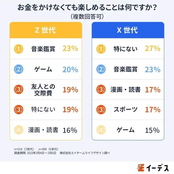 Z世代では「音楽鑑賞」(23%)、「ゲーム」(20%)、「友人との交際費」(19%)、「特にない」(19%)、「漫画・読書」(16%)が上位となった。