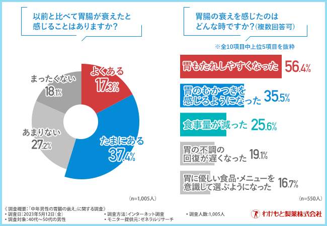 また、胃腸の衰えが「よくある」と「たまにある」という人は、合わせて「54.7%」にも上るミドルの実態が明らかになった。