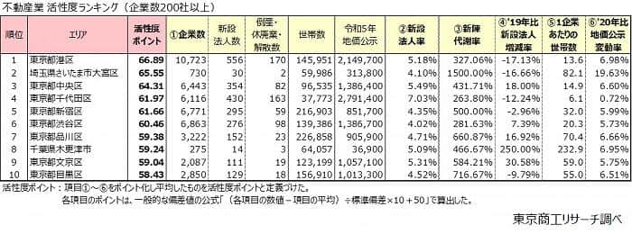 ランキングでは、首都圏の不動産業を対象に、(1)企業数、(2)新設法人率(全企業数に占める新設法人数)、(3)新陳代謝率(倒産、休廃業・解散に対する新設法人の割合)、(4)2019年から2022年の新設法人数増減率、(5)エリア別の1企業あたりの世帯数、(6)2020年1月から2023年1月の地価公示増減率、を市区郡ごとに算出し、エリア別に「活性度ポイント」を算出したものとなっている。