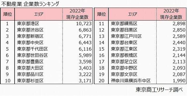 続いて、不動産業が最も集まっているエリアは「東京都港区」で1万723社だった。