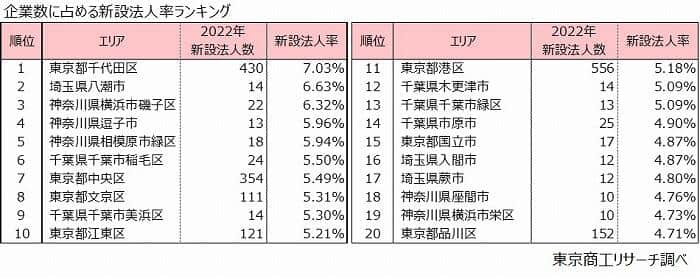 また、新設法人数が最も多い「東京都港区」は、新設法人率が「5.1%」で11位にランクインした。