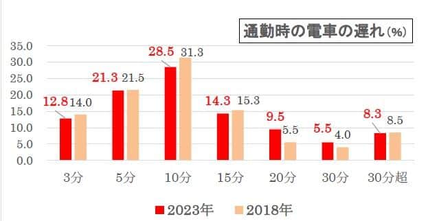 「10分まで」(3分と5分、10分の合計)では「62.6%」がイライラを感じており、18年調査の「66.8%」とほぼ同じ結果になった。日本の鉄道は定刻運行が当たり前になっているためか、朝の慌ただしい通勤時に電車が10分遅れるのは許せないようだ。
