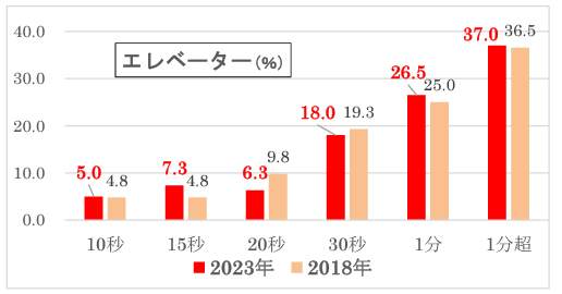 続いて、「エレベーターを待つ」の結果を見ると、エレベーターは「1分超」が「37.0%」、「1分」は「26.5%」が多く、この2つを合わせると「63.5%」に上った。エレベーターを待てる時間は「1分~1分超」が限界らしい。