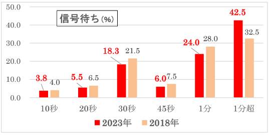 また、「歩行者として信号を待つ」では、イライラしはじめるのは「1分超」(42.5%)と「1分」(24.0%)が多く、この2つを合わせると「66.5%」を占めた。「1分超」はなんと、18年調査から10ポイントも増加しており、気長になっている傾向がみられる。