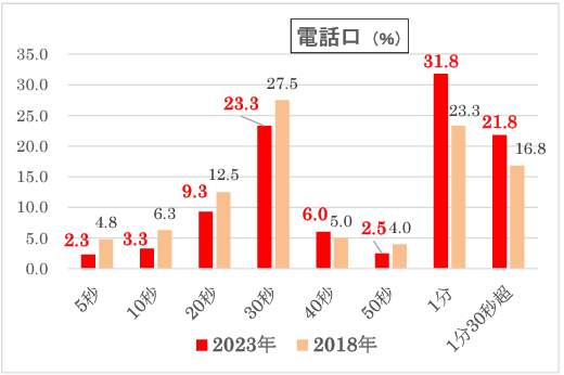 電話の保留は30秒、長くても1分以内が目安になりそうだ。18年調査では、「30秒まで」で半数を超えて(51.1%)いたので、少し気長になっている。