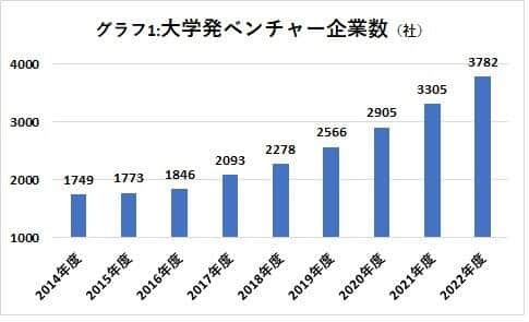 2022年度の大学発ベンチャー企業数は、前年度比477社(14.4%)増加して3782社となった。このうち、2021年度末までに未把握だったのが356社、大学との関連がなくなったのが83社、解散等を行ったのが40社あり、22年度に新規設立されたのは244社だった。(グラフ1)