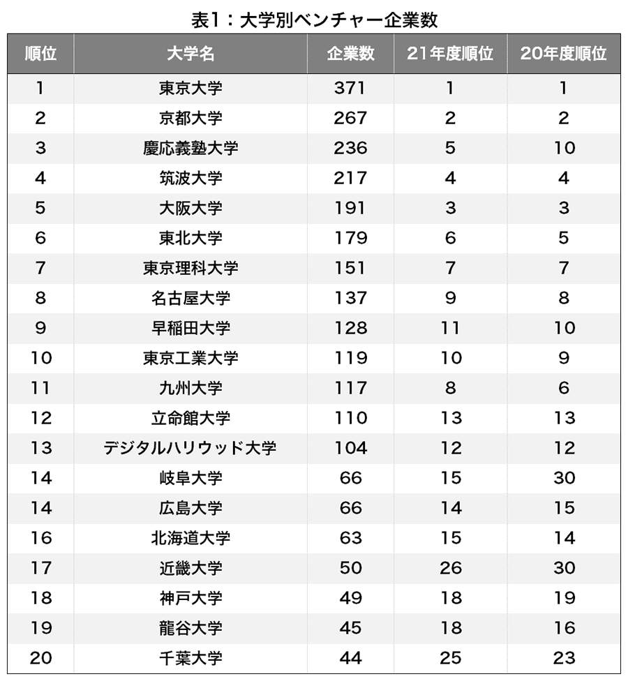 また、2020年4月に専門職大学として開学した情報経営イノベーション専門職大が2021年度の69位で7社から15社に設立数を倍増させて47位に入った。秋田大学も78位の6社から11社に伸ばして58位に入る躍進を見せた。
