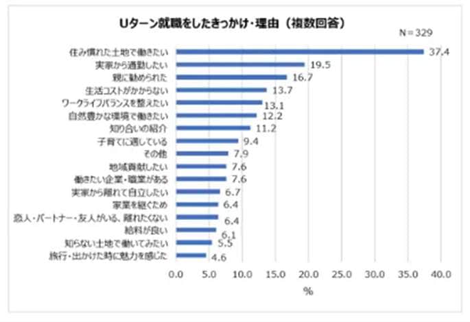 まず、Uターンで就職した人(n=329人)に、そのきっかけを聞いたところ、最も多かったのは、「住み慣れた土地で働きたい」(37.4%)だった。次に、「実家から通勤したい」(19.5%)、「親に勧められた」(16.7%)、「生活コストがかからない」(13.7%)と続いた。