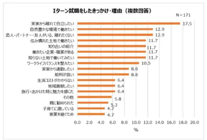 また、Iターンで就職した人(n=171人)にきっかけを聞くと、「実家から離れて自立したい」と答えた人が17.5%と最も多く、Uターンとは真逆の結果になった。