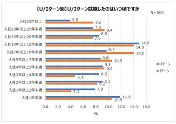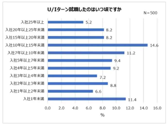 次に、Uターン・Iターン就職したタイミングについて聞くと、「入社10年以上15年未満」と答えた人が14.6%と最も多く、一定のキャリアを積んだ後に転職する人が少なくないことがわかった。