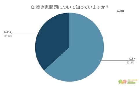 高齢化が進む日本では、2030年には空き家が430万戸になると言われている。そこでまずは単刀直入に、「空き家が20年間で2倍近くに増加しており、2030年には430万戸になると予測された問題を知っているか」と質問したところ、「はい(知っている)」と答えたのは、「63.2%」で過半数を超えた。今後高齢化がさらに進むなかで、「空き家」の問題を認知している人が多いようだ。