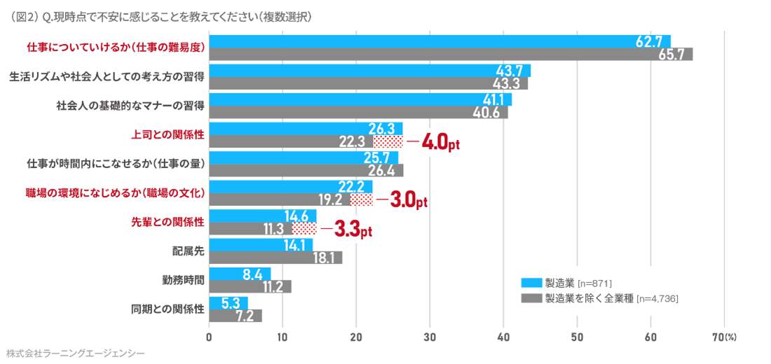 製造業の新入社員の場合、「上司との関係性」が「26.3%」でほかの業種の「22.3%」より4ポイント高い。「職場の関係になじめるか(職場の文化)」が「22.2%」で、ほかの業種の「19.2%」より3ポイント高い。それから、「先輩との関係性」は「14.6%」で、これもほかの業種より高くなった。