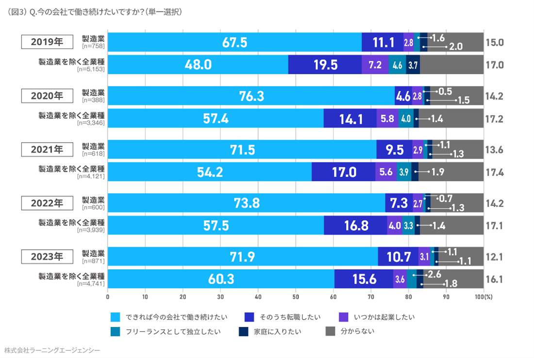 一方で、他業種より「期待」が高いという結果が出た製造業新入社員だが、入社した会社で働き続ける意欲はどのくらいあるのだろうか? これについて聞いたところ、結果は、「できれば今の会社で働き続けたい」と回答した新入社員は「71.9%」となり、ほかの意見を大きく引き離した。