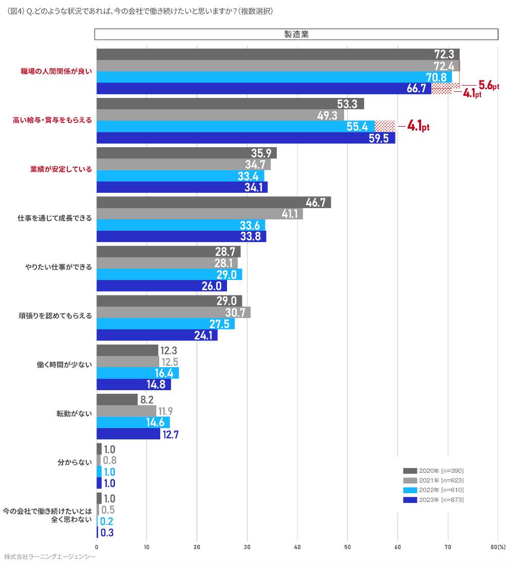 続いて、どのような状況であれば、今の会社で働き続けたいと思うのかを質問した。最多の回答は「職場の人間関係が良い」が「66.7%」。次いで「高い給与・賞与がもらえる」が「59.5%」、「業績が安定している」が「34.1%」という結果になった。